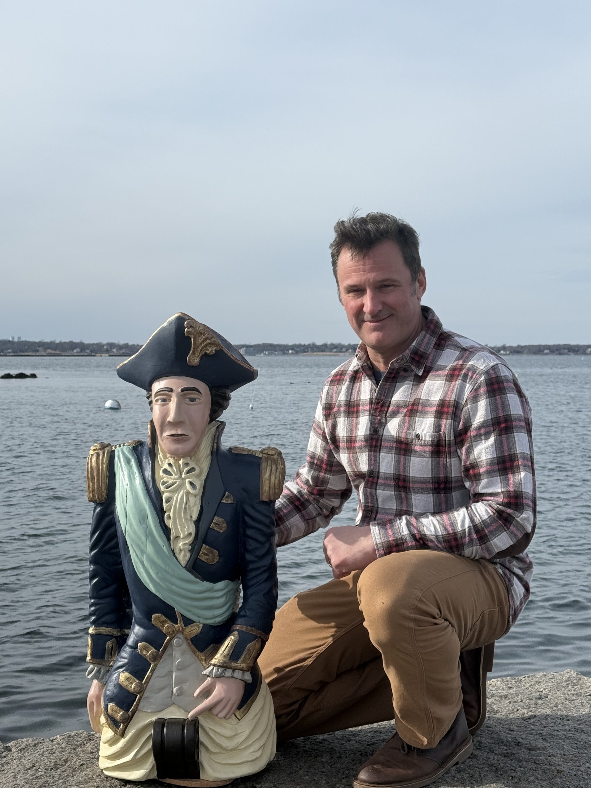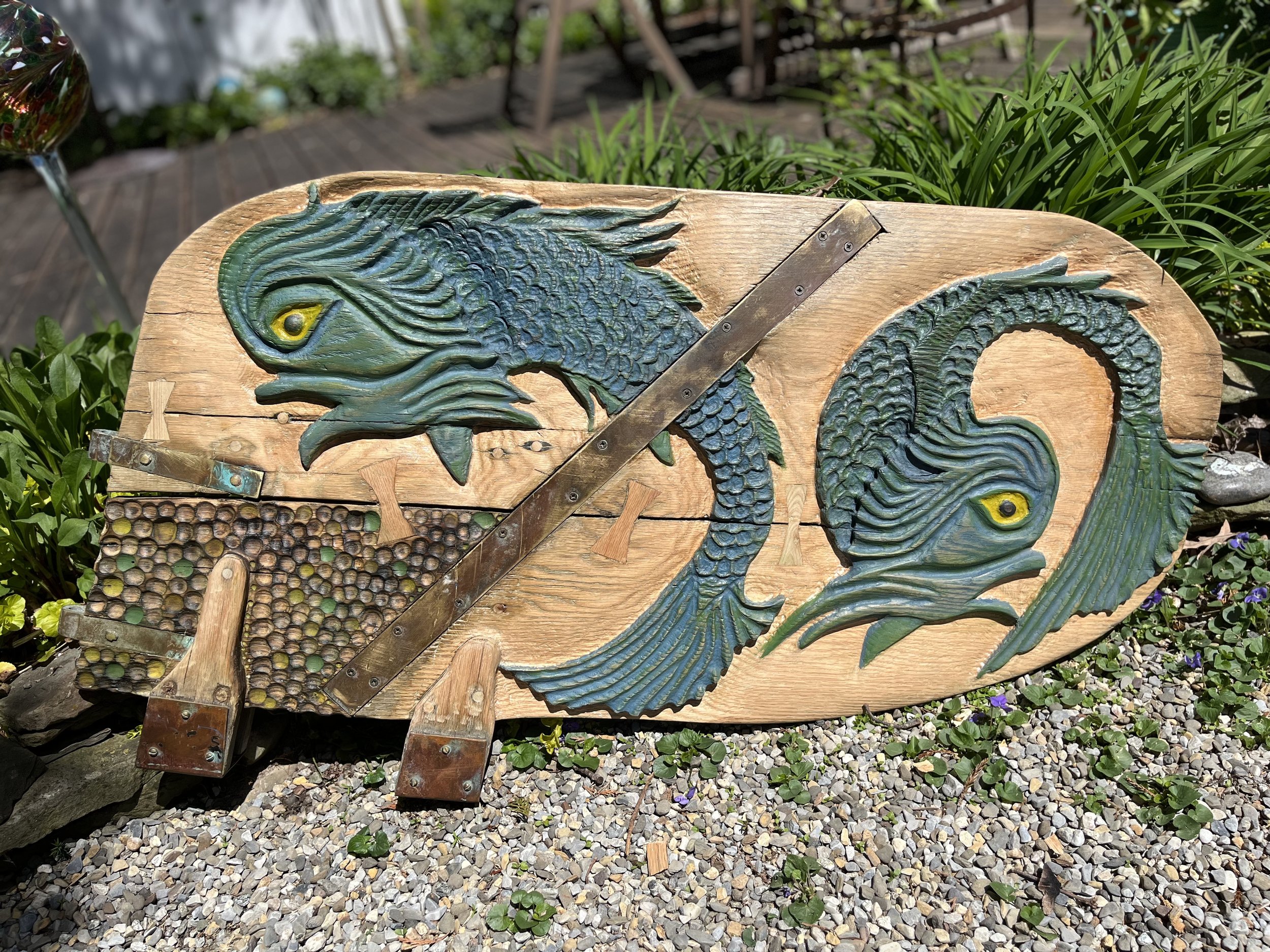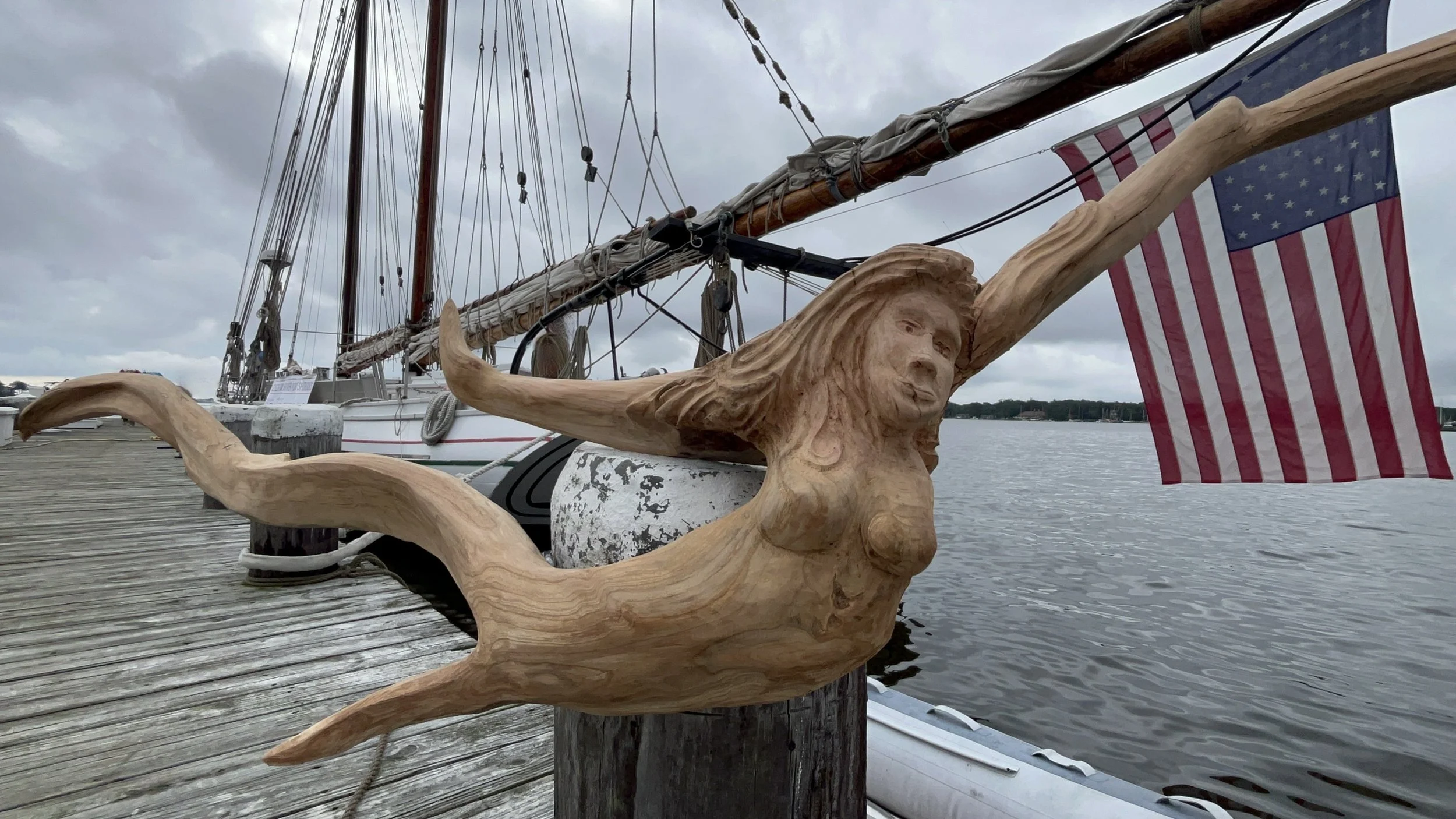 His carvings often depict marine life—whales, seahorses, horseshoe crabs—and nautical motifs inspired by colonial figureheads, maritime folklore, and American seafaring history.