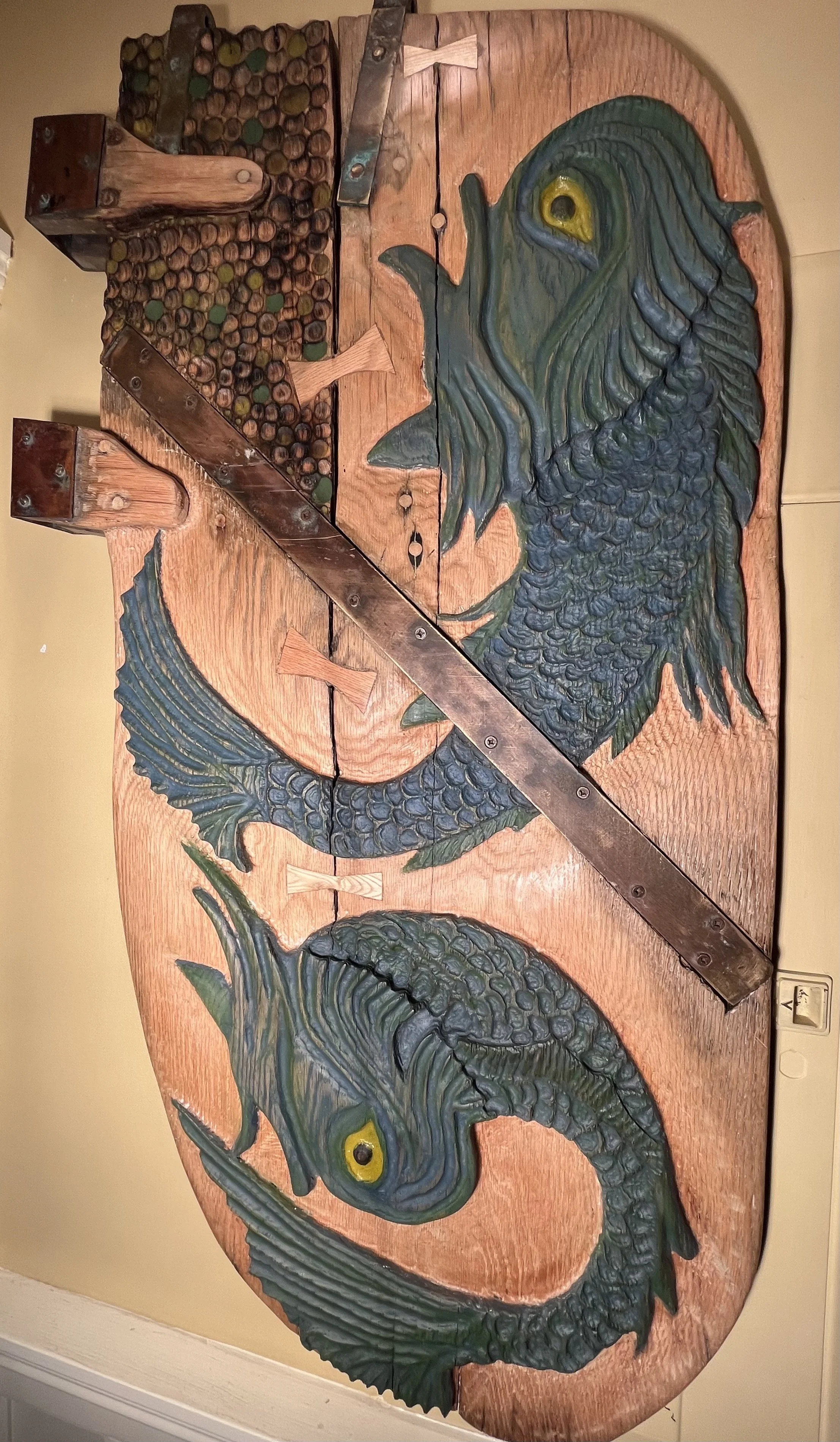 Heraldry rudder - This white oak marine salvage piece has been relief carved with two Heraldic dolphin while maintaining it’s original brass hardware. The dolphin is a symbol of loyalty, naval prowess and the protector of sailors. The wood is finished in high quality oil and wax. The dolphin are oil painted and sealed with wax.